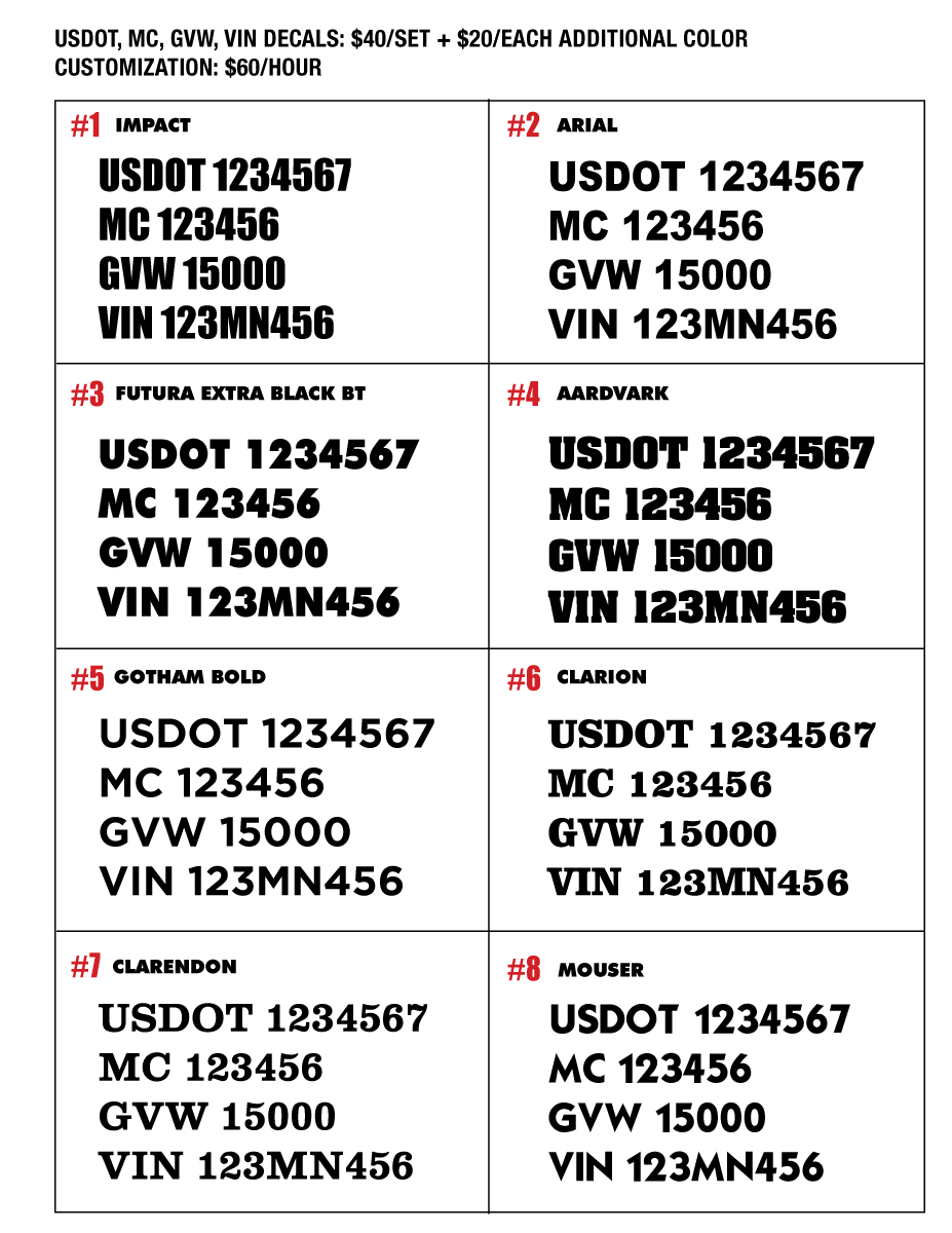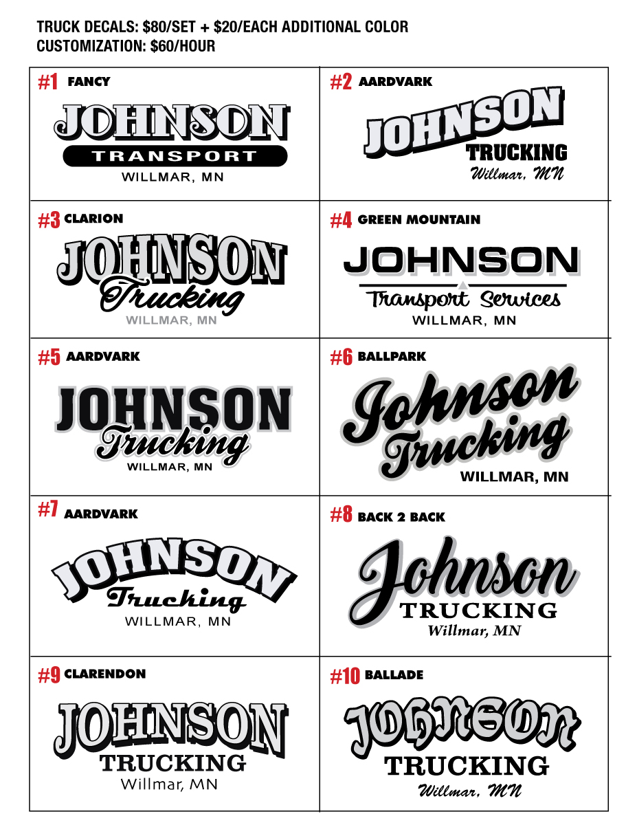 Choose from the options below to order your semi door lettering set. Please note that all decals will be made in proportion to the design that you choose based on the size length that you specify below. If you need a specific size, please note it in the special instructions message section. If you would like a specific design, please email it over or stop in and we will get you a quote. Metallics and other color options are available. Please stop in to choose specific colors. Shipping will be a flat $12.00 fee per total online order.
